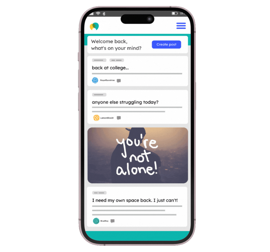 Get 24/7 support in a safe, anonymous online community. Whether you’re facing challenges, looking for guidance, or simply need a space to express yourself, you’re not alone.